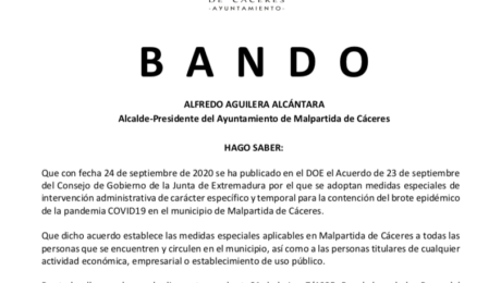 ALFREDO AGUILERA ALCÁNTARA Alcalde-Presidente del Ayuntamiento de Malpartida de Cáceres HAGO SABER: Que el pasado 7 de septiembre la Junta de Extremadura declaró oficialmente un brote de COVID19 en Malpartida