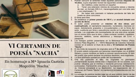 Continúa abierto el plazo de presentación de trabajos para el VI Certamen de Poesía «Nacha», la Biblioteca Municipal de Malpartida de Cáceres, con la colaboración del Ayuntamiento de la localidad