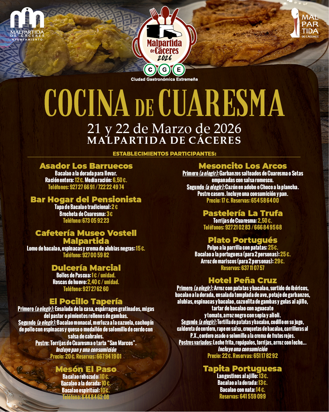 La ‘Cocina de Cuaresma’ protagonizará la programación de la Capitalidad Gastronómica 2026 de Malpartida de Cáceres para el mes de marzo, una iniciativa que pretende poner en valor la riqueza culinaria del municipio y el importante papel que desempeñan los establecimientos hosteleros locales.